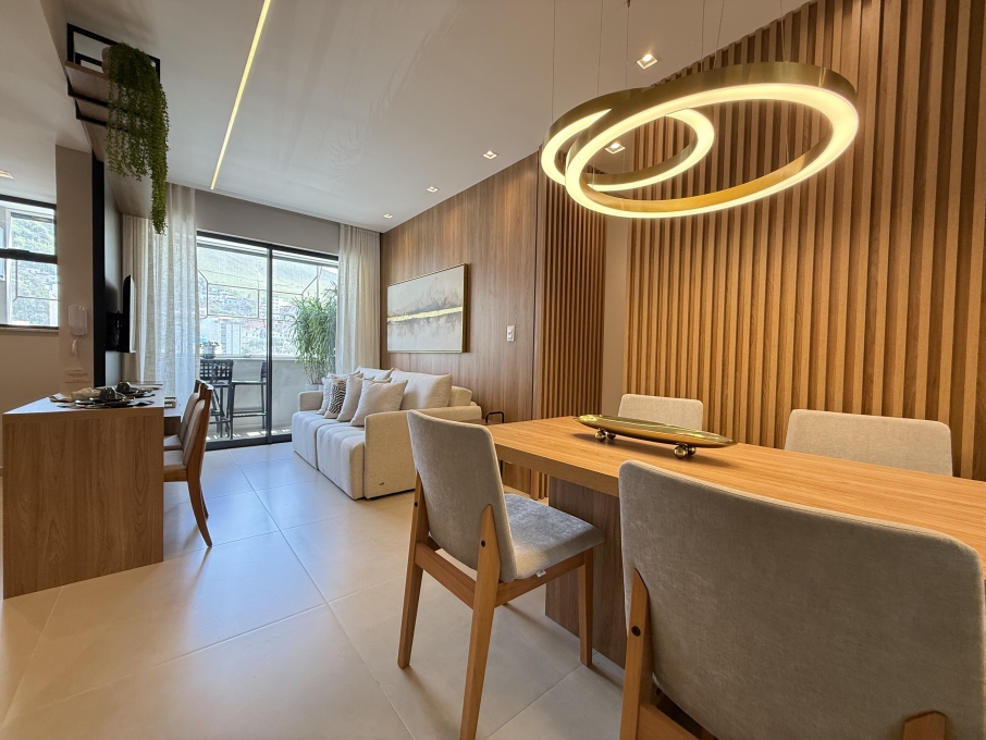 Este apartamento tem 2 suítes, uma boa sala com cozinha integrada, varanda e área de serviço.